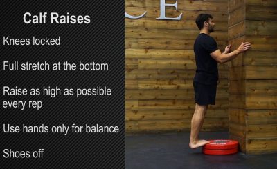 Calf Raises 1. Knees locked 2. Full stretch at the bottom 3. Raise as high as possible every rep 4.…
